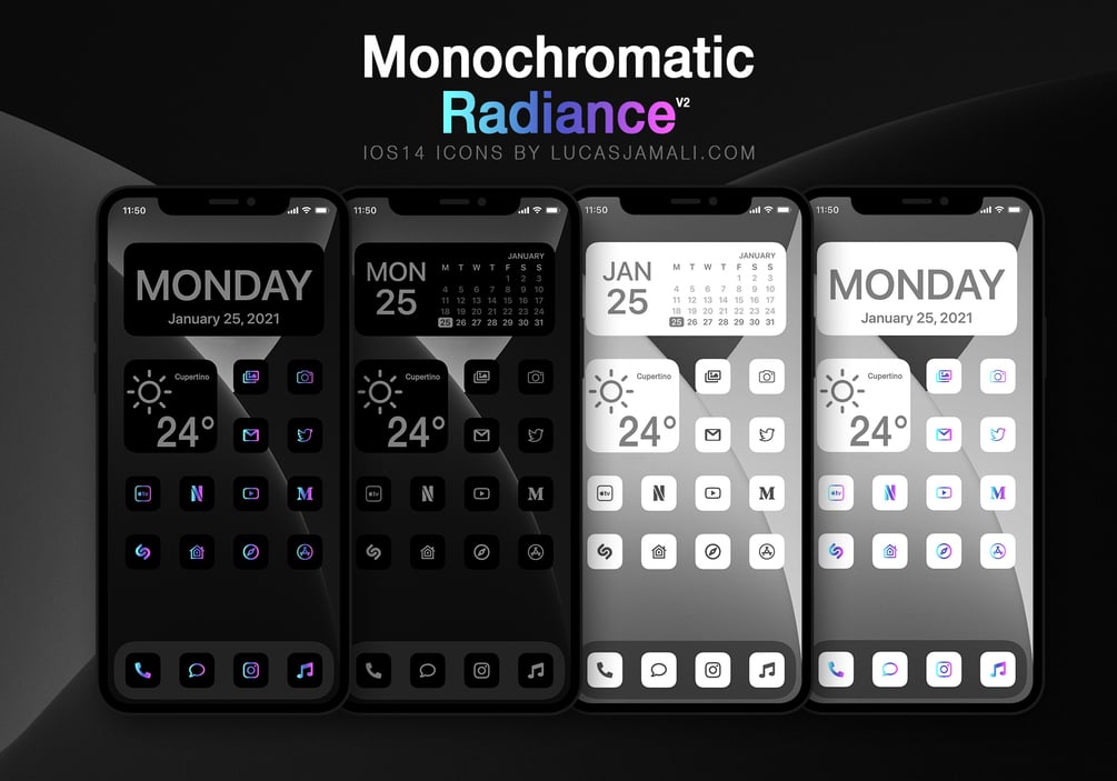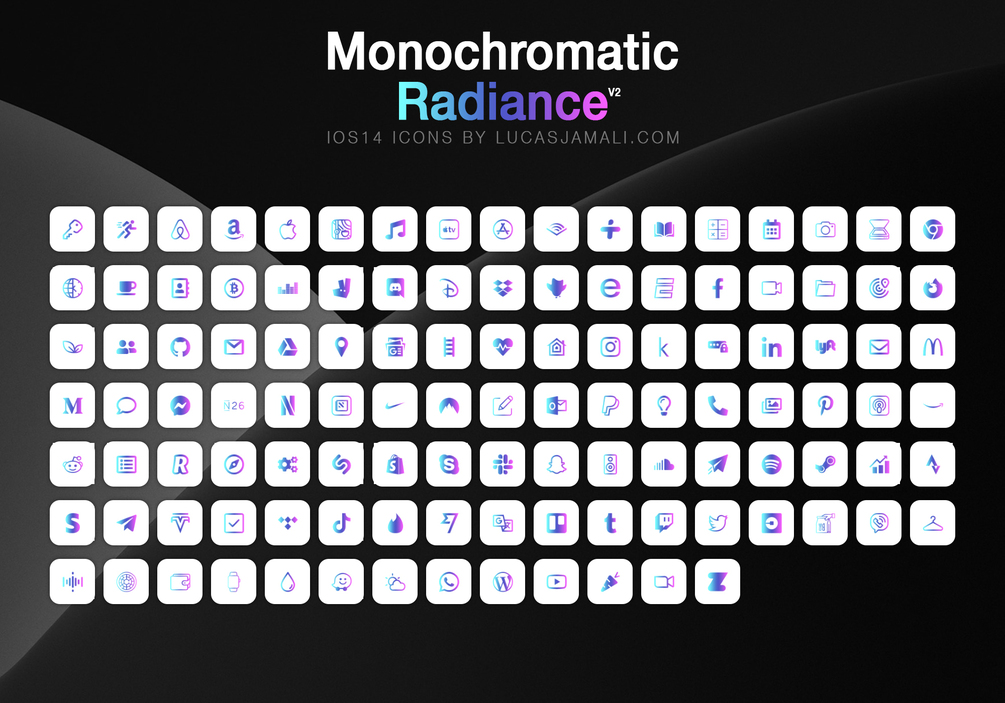 Monochromatic x Radiance offers 100+ unique icons in four variations. The definitive package for the iOS style enthusiast. Combines both Monochromatic and Radiance at a single reduced price. The most efficient choice for the most desiring. Grab the Lite version for a free sample of the icons.